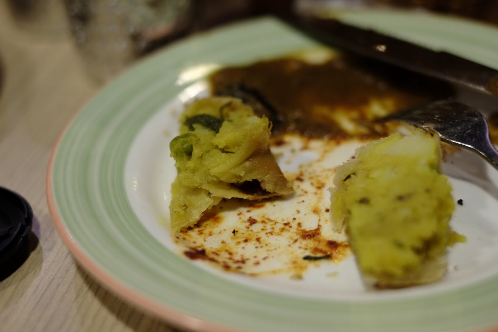 香酥的外皮加上熱呼呼的內餡有兩種沾醬,一種蕃茄咖哩(立馬跳過),一種是綠咖哩(就像喝小麥草汁一樣,單吃會以為自己是少草食性動物),我覺得吃原味比較優,其他人是比較喜歡沾蕃茄吃。